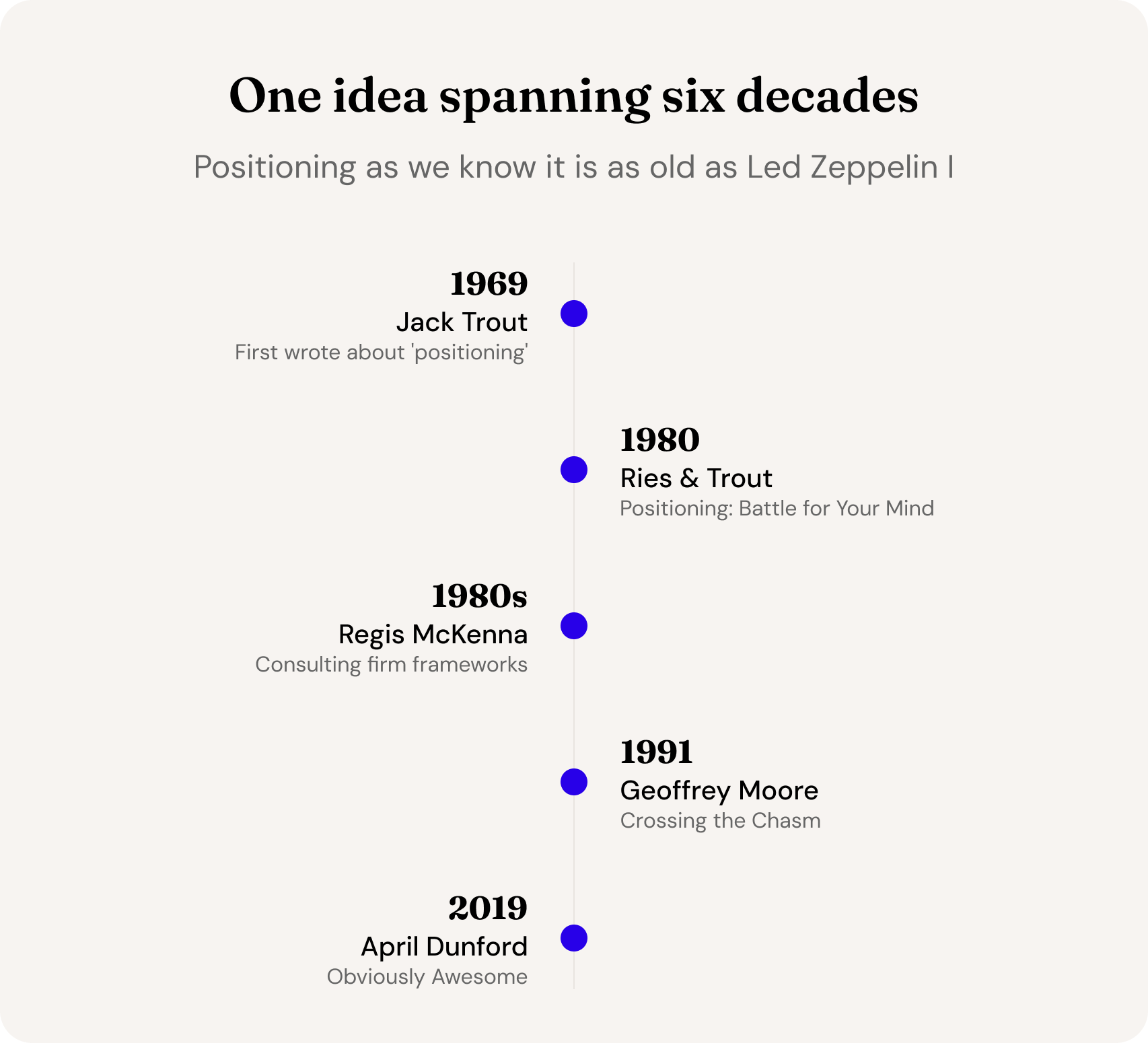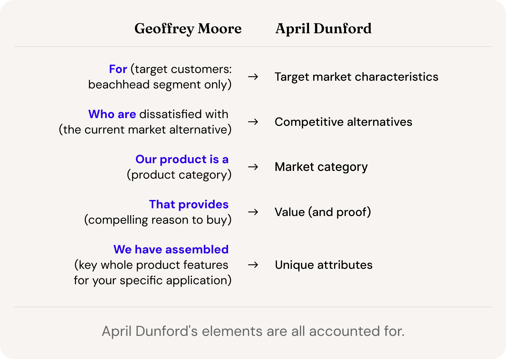 But I don’t think April Dunford changed Geoffrey Moore’s elements of positioning, which he probably picked up from his colleagues at Regis McKenna, who were probably influenced by Jack Trout.